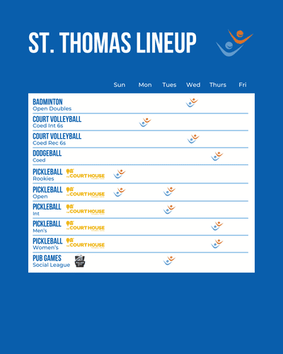 We're working hard to bring the best selection of sport and social to St. Thomas, so stay tuned for changes and additions to the lineup!